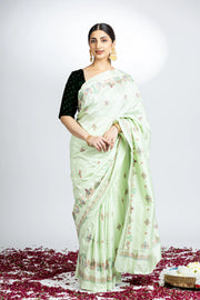 Ilkal Saree Online: Authentic, Pure & Premium Quality Ilkal Art Silk Saree with Kasuti Embroidery, carefully curated by our Designers at Mandakini. This is NOT a hand-embroidered saree. The saree comes with un-stitched blouse piece attached to it